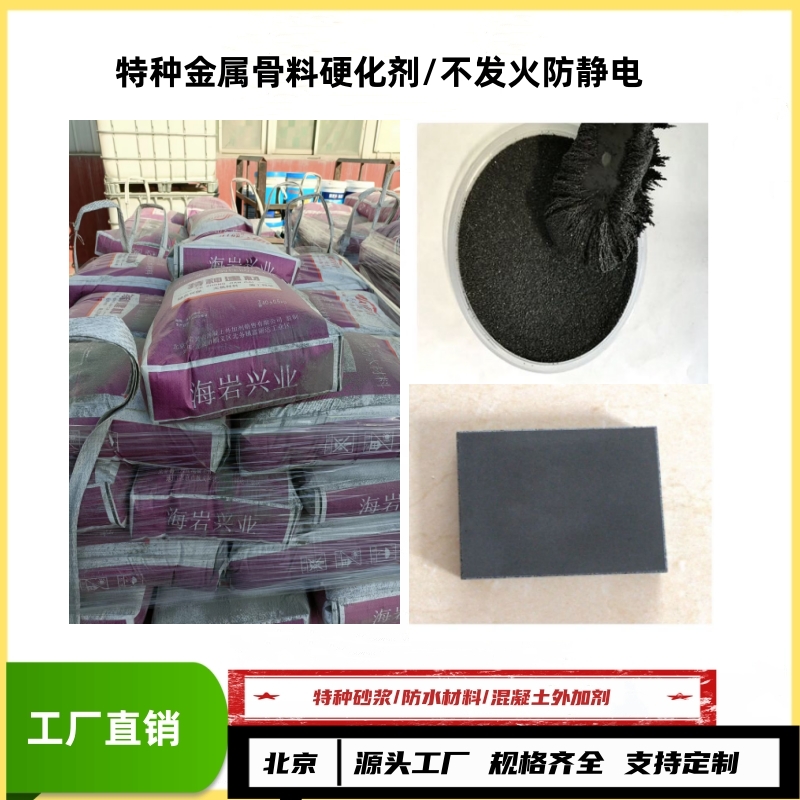 不发火金属骨料硬化剂性能优势 不发火金属骨料硬化剂施工推荐用量 北京海岩兴业工厂订购生产,可贴牌代加工,欢迎在线咨询! 不发火性: 材料中的金属骨料和金属或坚硬石块等物体与该类混凝土发生摩擦冲击等机械作用时,均不发生红灼火花或火星。 防静电火花:防静电火花产生和导电能力,可传导地面的静电。 耐久性强:抗压强度高,耐高低温,性能稳定,高耐磨,高承载力。 混凝土初凝时干撒,一般要求2-3mm厚,一平米用量5-6kg,与各种新旧混凝土地面直接粘接,随打随抹光不易分层。 防水/抗油/抗渗透,防水可抵抗油脂,易清洁地面,经过连续使用后可增加光滑度。